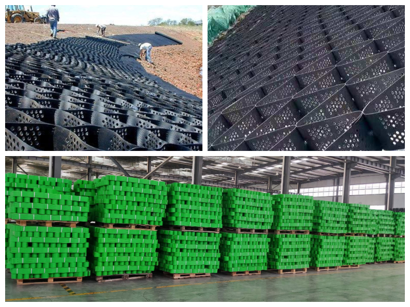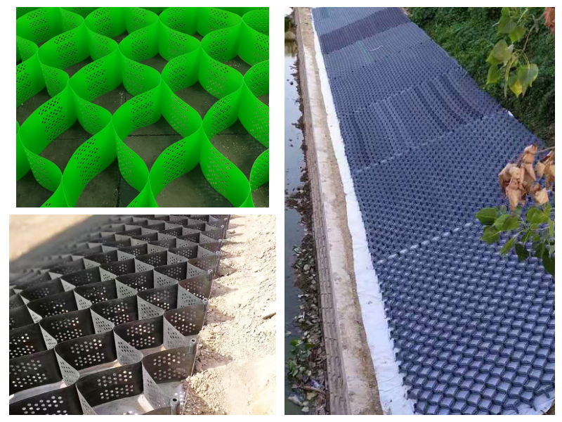 It is mainly divided into geocell, high-strength geocell, and honeycomb restraint sys- tem (Honeycomb restraint system: it is a three-dimensional network made of polymer broadband with ultrasonic welding, and the cells constitute a strong lateral restraints and stiffness structure by filling with materials such as sand, stone or concrete).